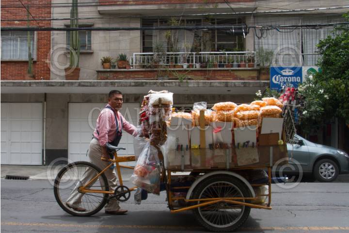 CIUDAD DE MÉXICO, 12SEPTIEMBRE2019.- Hombre empuja un triciclo cargado de botanas y papas fritas por las calles de la Colonia Roma. FOTO: ROGELIO MORALES /CUARTOSCURO.COM