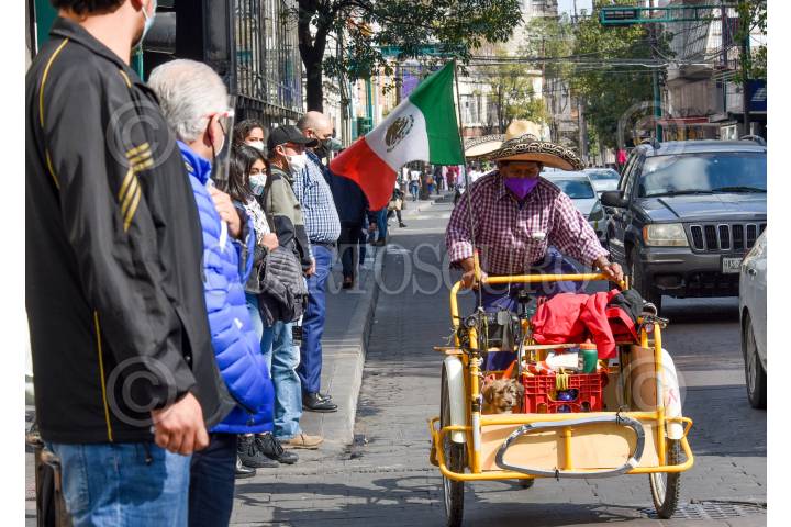 Orgulloso pasea este hombre en su triciclo en la capital mexiquense portando su sombrero de charro y una bandera de México, con su pequeño perro al frente.