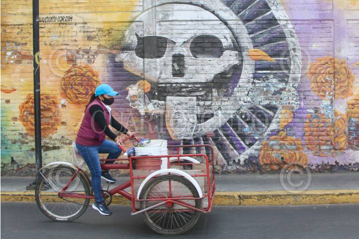 Una mujer recorre la periferia de la Plaza Cívica de Iztapalapa en su triciclo, frente a mural alusivo al Dios del Inframundo en la cultura Mexica.