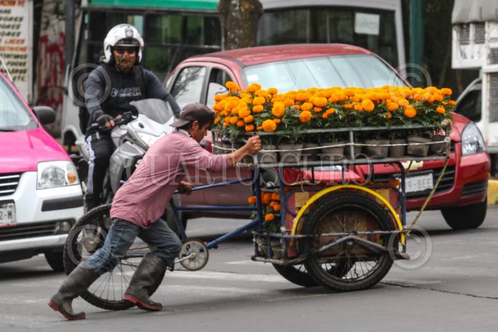 Un hombre empuja su triciclo repleto de flor de cempasúchil, para cruzar una avenida en Xochimilco.