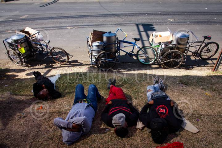 Vendedores de tamales en triciclo duermen a la sombra de un árbol en un camellón sobre el Eje 6 sur en Iztapalapa.