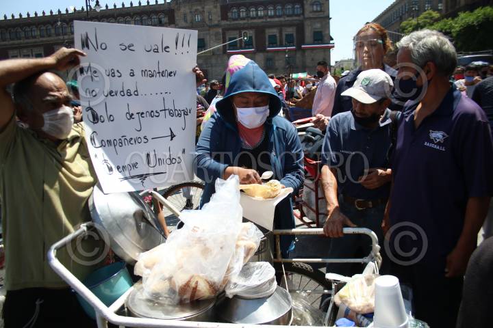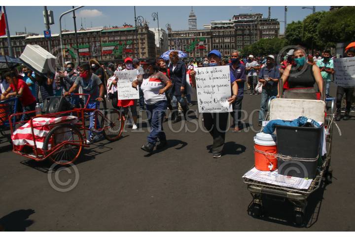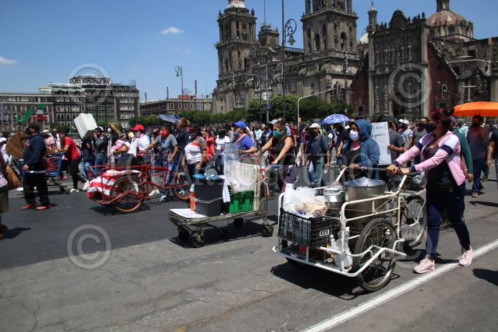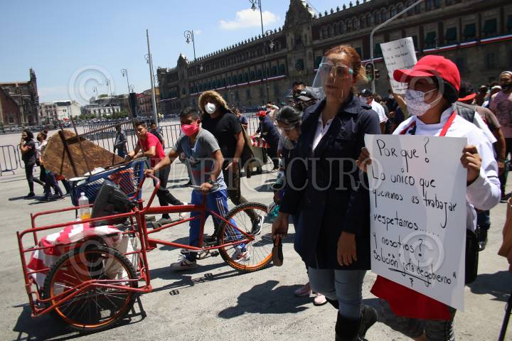 Vendedores de comida en triciclos se manifestaron en el zócalo para exigir a la Jefa de Gobierno que detengan los operativos en su contra.