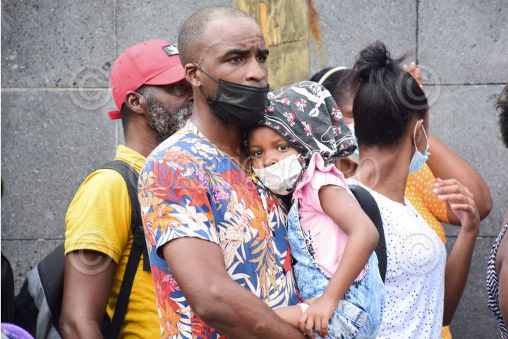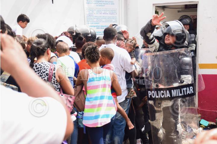 Migrantes de distintas nacionalidades que se concentraron para pedir una cita ante las autoridades del Instituto Nacional de Migración, tuvieron una ligera trifulca con elementos de la Guardia Nacional después de que informarán sólo la atención de mujeres y niños.