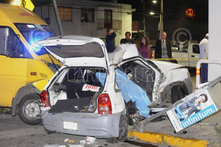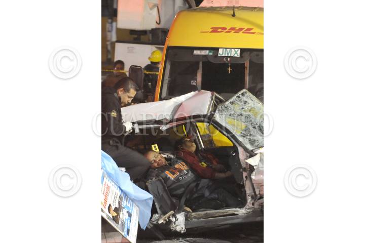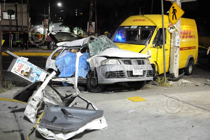 MEXICO, D.F., 04FEBRERO2012.- Tres hombres mueren tras el auto en el que viajaban ser impactado por una camioneta de la empresa DHL en el cruce de Avenida Politecnico y Poniente 112 de la colonia Lindavista, en la Delegación Gustavo A. Madero. Dos personas mas, fueron trasladados por ambulancias al Hospital Magdalena de las Salinas. FOTO: LUIS CARBAYO/CUARTOSCURO.COM