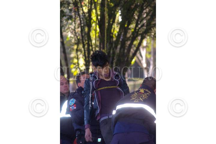 MÉXICO, D.F., 27DICIEMBRE2012.- Un joven de aproximadamente 20 años, decidió quitarse la vida colgándose de un árbol al interior del parque de la montaña ubicado en paseos de Naranjos y Paseos de Nogales, colonia Paseos de Tasqueña delegación Tlalpan. Personal de rescate acudieron para bajar el cuerpo y trasladarlo al Semefo. Al momento se ha registrado un aumento del 30 % de aumento en este tipo de muertes siendo los hombres quienes logran consumar las muertes, en un comparativo de cada 5 hombres solo una mujer lo logra consumar su muerte, según informes ofrecidos por la PGJDF. FOTO: LUIS CARBAYO /CUARTOSCURO.COM