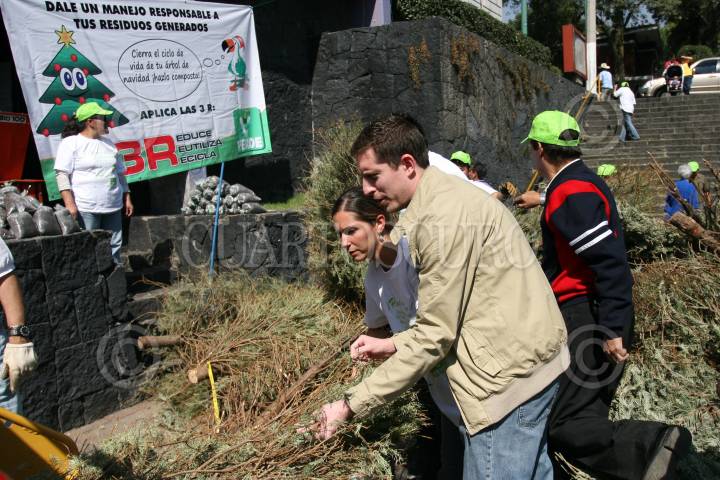MÉXICO D.F., 28ENERO2009.- Mariana Boy, Secretaria de Ecología del Partido Verde Ecologista de México y Diego Cobo Terrazas, Diputado Federal del PVEM, encabezaron el acto donde trituraron 500 árboles navideños para la elaboración de composta, con esto el partido pretende generar una política nacional para el tratamiento de residuos y eliminar la incineración de estos como método de disposición final. FOTO: GUILLERMO PEREA/CUARTOSCURO.COM