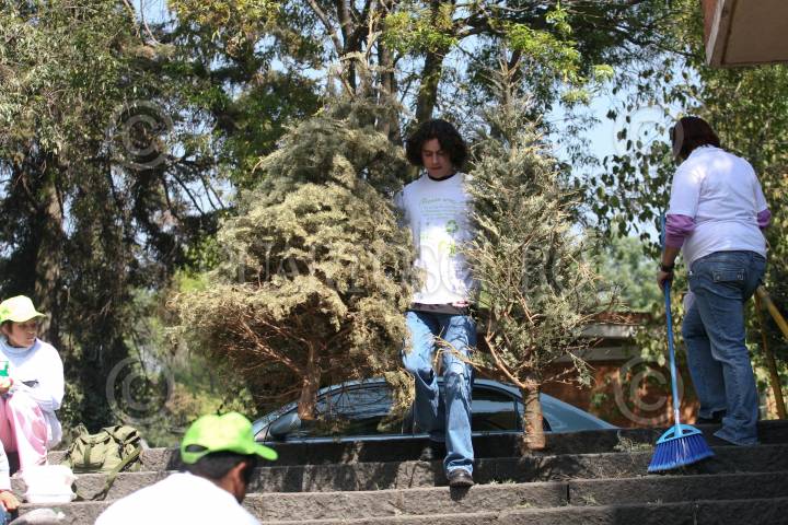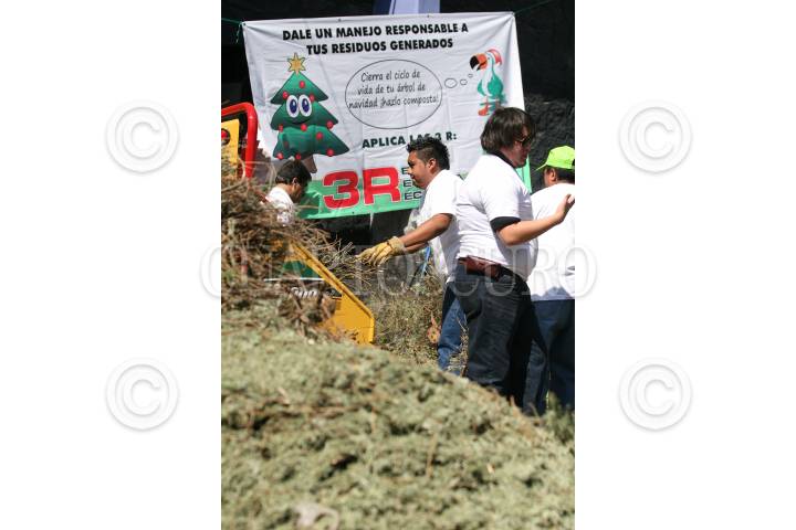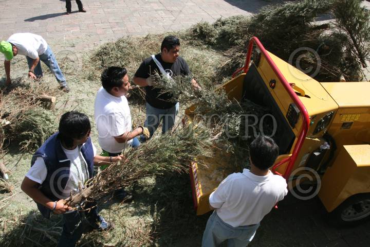 MÉXICO D.F., 28ENERO2009.- Integrantes del Partido Verde Ecologista de México, trituraron 500 árboles navideños para la elaboración de composta, con esto el partido pretende generar una política nacional para el tratamiento de residuos y eliminar la incineración de estos como método de disposición final. FOTO: GUILLERMO PEREA/CUARTOSCURO.COM