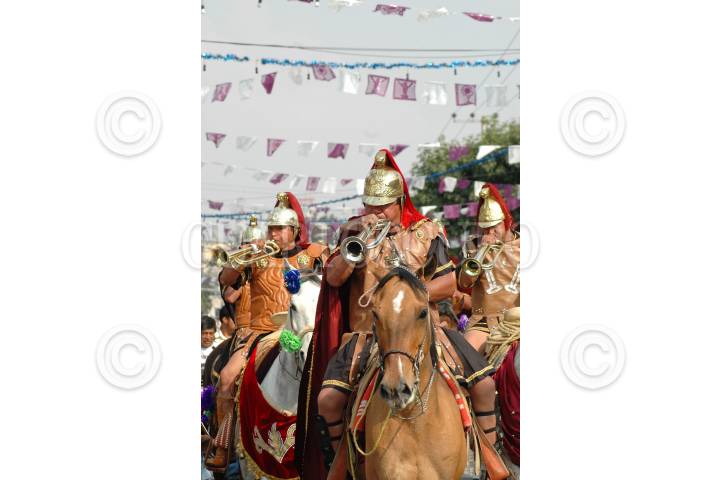 MÉXICO, D.F., 20MARZO2008.- Romanos sobre sus caballos tocan las trompetas durante el recorrido de los 8 barrios en la tradicional representación de La Pasión en la delegación Iztapalapa. FOTO: RODOLFO ANGULO/CUARTOSCURO.COM