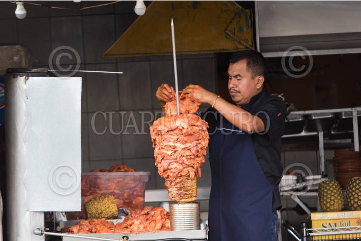 Un taquero prepara la carne al pastor en una taquería de la alcaldía Gustavo A. Madero.