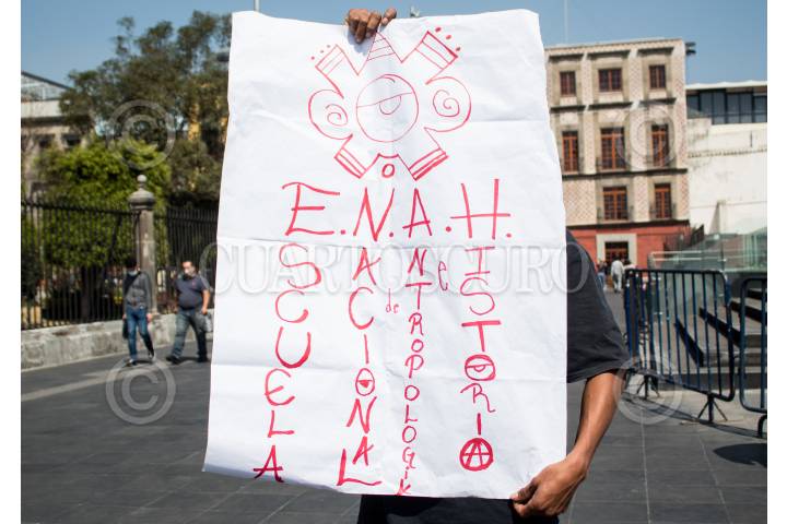 Miembro de la ENAH en el Centro Histórico de la CDMX sosteniendo pancarta