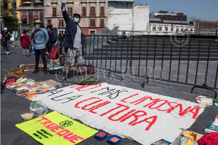 Protestantes de la ENAH a un costado del Templo Mayor de la CDMX realizan trueque de libros, plantas, ropa y accesorios para reunir fondos