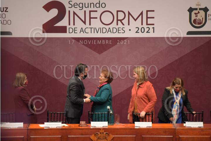 Inés Romero Cruz, presidenta del Tribunal Superior de Justicia del Estado (TSJE) y del Consejo de la Judicatura del Estado de Veracruz, ofreció su segundo informe de labores. En la imagen Cuitláhuac García, gobernador de la entidad, la saluda.