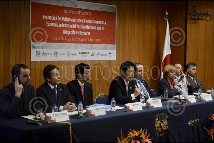 CIUDAD DE MÉXICO, 06SEPTIEMBRE2016.- Víctor Cruz Atienza, jefe de departamento de Sismología del Instituto de Geofísica de la Universidad Nacional Autónoma de México (UNAM); Kazuyoshi Shinoyama, director general en México de la Agencia de Cooperación Internacional de Japón (JICA); Akira Yamada, embajador de Japón en México; Taido Tanose, viceministro parlamentario de Educación, Cultura, Deportes, Ciencia y Tecnología de (MEXT-Japón); Leonardo Lomelí Vanegas, secretario general de la UNAM; Gina Casar, directora ejecutiva de la Agencia Mexicana de cooperación Internacional para el Desarrollo (AMEXCID), y Arturo Iglesias Mendoza, director del Instituto de Geofísica de la UNAM, presentaron el proyecto “Evaluación del Peligro Asociado a Grandes Terremotos y Tsunamis en la Costa del Pacífico Mexicano para la Mitigación de Desastres”, iniciativa que pretende reducir y prevenir los daños ocasionados por dichos desastres naturales. FOTO: GALO CAÑAS /CUARTOSCURO.COM