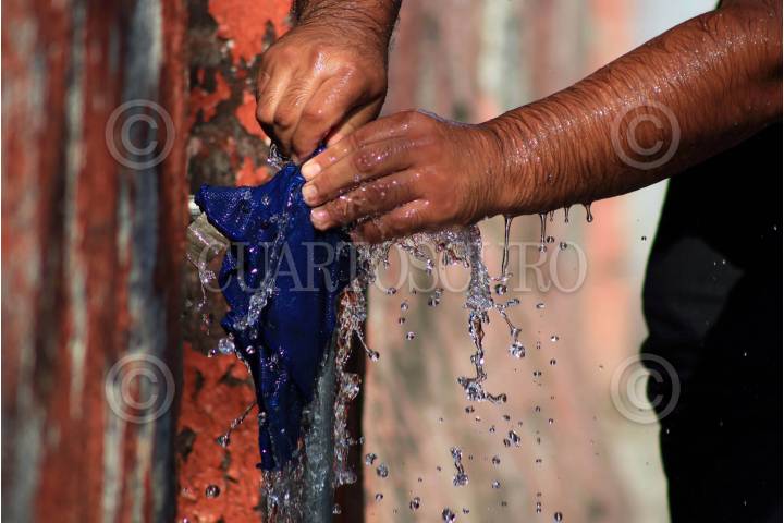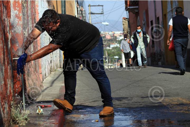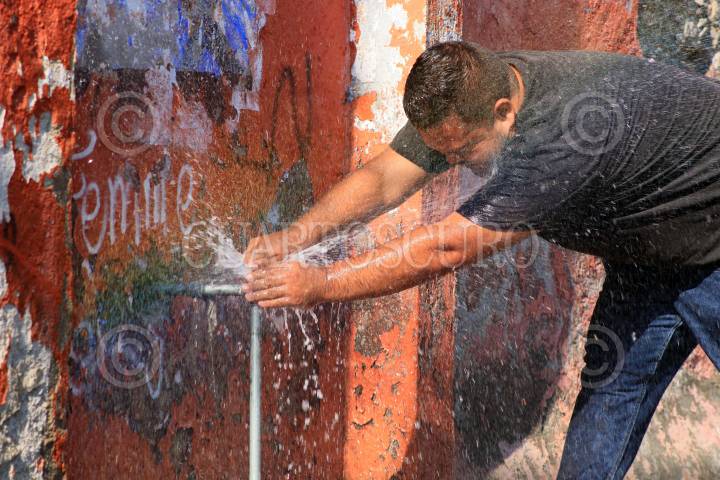 Un trabajador del Servicio de Agua y Alcantarillado de Cuernavaca intenta controlar el agua que sale de una tubería.