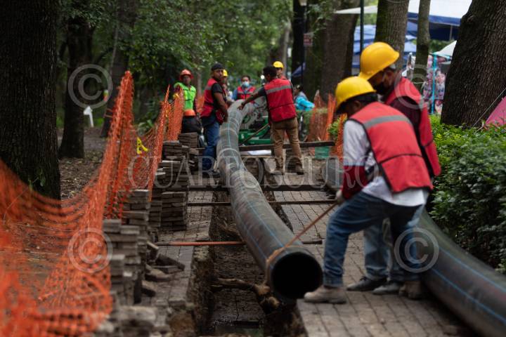Trabajadores de Gobierno realizan trabajos de tubería en el Bosque de Chapultepec