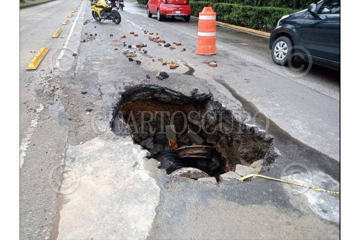 Socavón formado por la ruptura de una tubería de aguas negras en Tlalpan a la altura de Insurgentes Sur y Cantera.