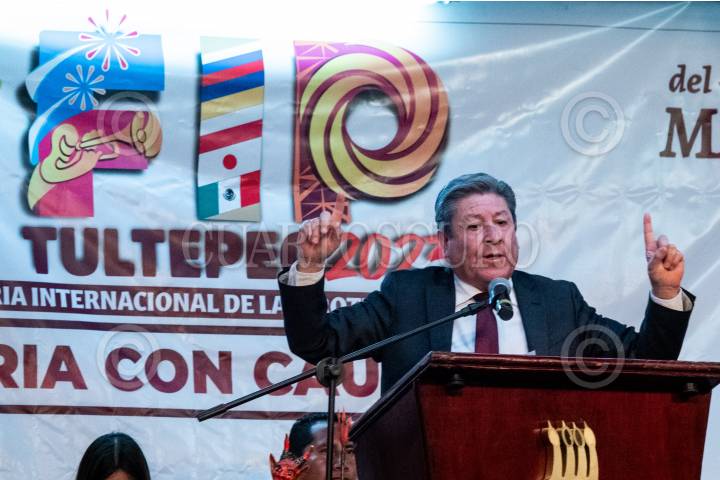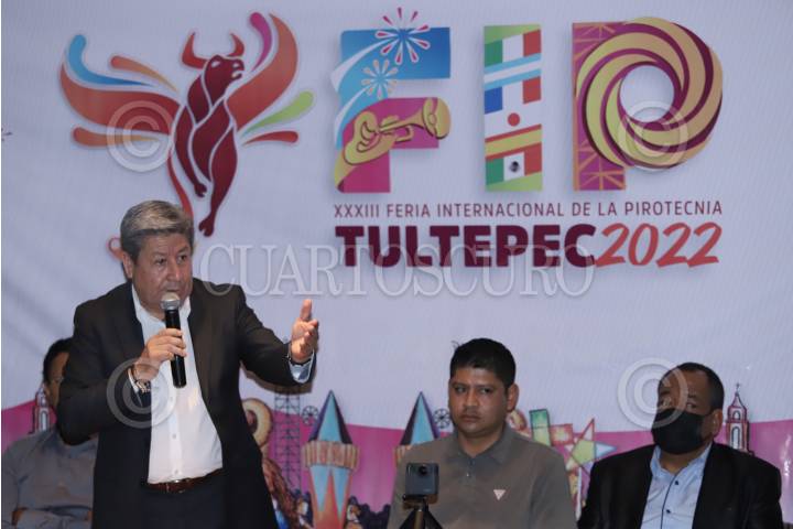 El presidente municipal de Tultepec Ramón Sergio Luna durante la conferencia de prensa de la XXXIII Feria Internacional de Pirotecnia Tultepec 2022, donde se dieron a conocer las actividades a realizarse del 4 al 14 de marzo.