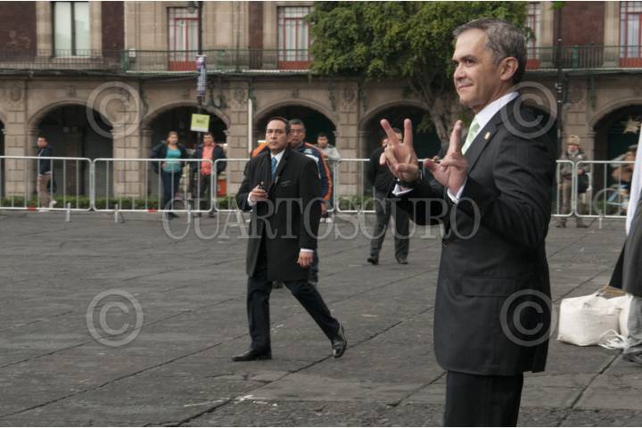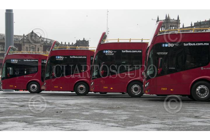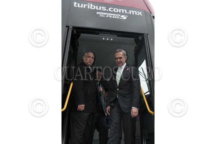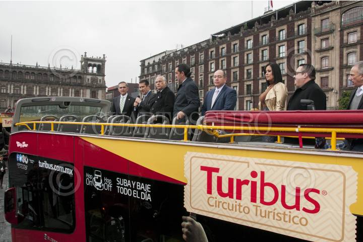CIUDAD DE MÉXICO, 16NOVIEMBRE2016.- Miguel Ángel Mancera, Jefe de Gobierno, y Miguel Torruco Márques, Secretario de Turismo, dieron el banderazo de salida de 10 turibuses nuevos, en la explanada de la Plaza de la Constitución. Los unidadescuentan con servicio WI-FI, pantallas de alta definición, sistema de audio con 10 idiomas, entre otros sevicios. FOTO: PAULINA NEGRETE /CUARTOSCURO.COM
