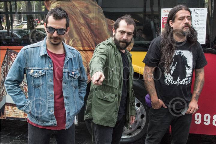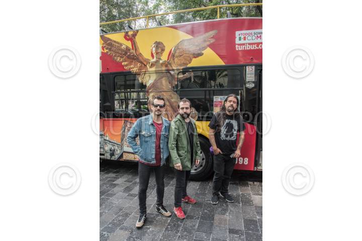 CIUDAD DE MÉXICO, 13FEBRERO2018.- La banda chilena "Weichafe", conformada por Diego Ormazábal, Angelo Pierattini y Marcelo Da Venezia, presidieron la presentación de "Turirock" la cual será una nueva alternativa en el concepto turístico de Turibús, y consiste en llevar a los fanáticos a los conciertos que se realizen en la Carpa Astros, teniendo como punto de partida Reforma 222. FOTO: MARIO JASSO /CUARTOSCURO.COM