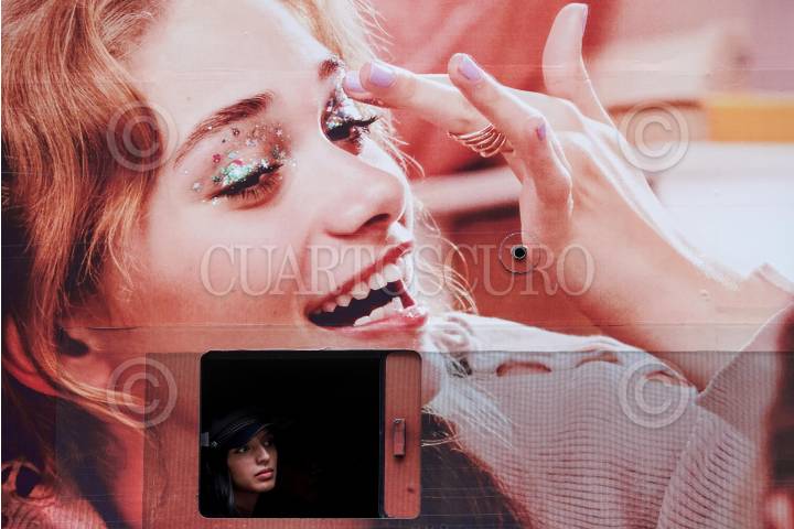 CIUDAD DE MÉXICO, 04JULIO2024.- Una joven se asoma por la ventana de una unidad de Turibús cubierta por una publicidad de maquillaje en calles del Centro Histórico FOTO: GALO CAÑAS/CUARTOSCURO.COM