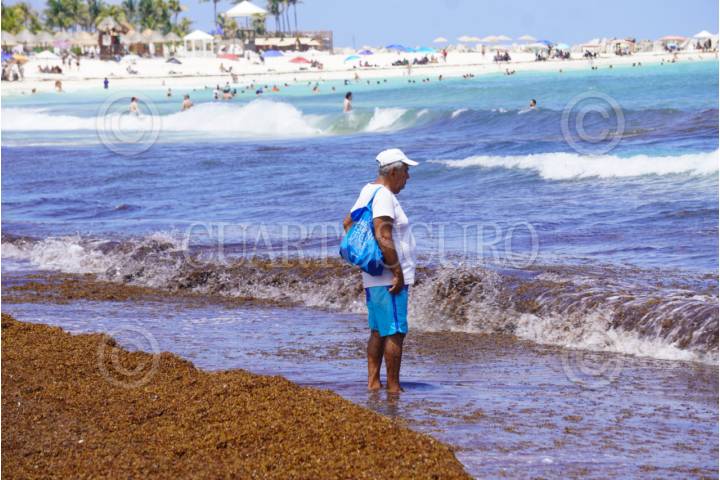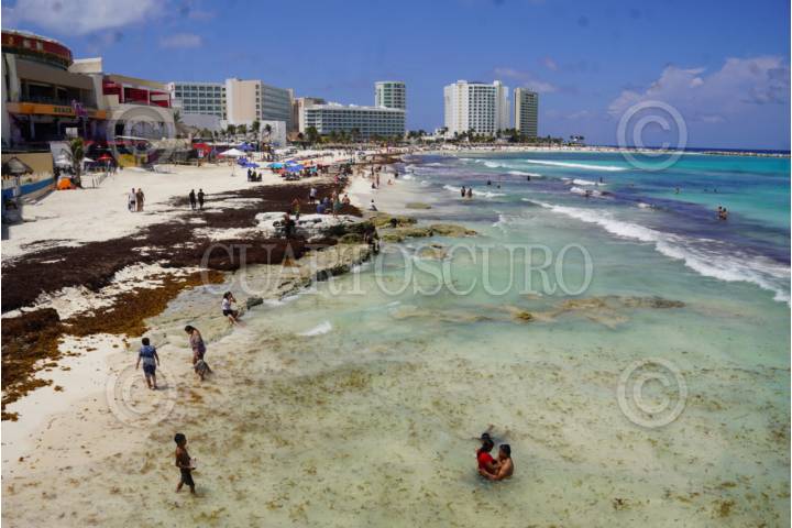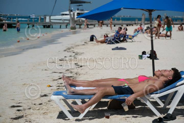 CANCÚN, QUINTANA ROO, 08JUNIO2025.- Las grandes cantidades de sargazo que recalan en las playas de Cancún no son impedimento para que cientos de personas, entre turistas y residentes, se lancen a las playas buscando refrescarse. FOTO: ELIZABETH RUIZ7CUARTOSCURO.COM