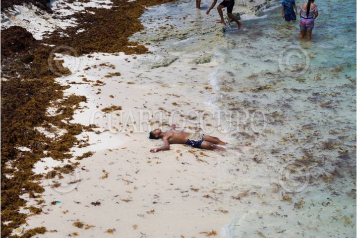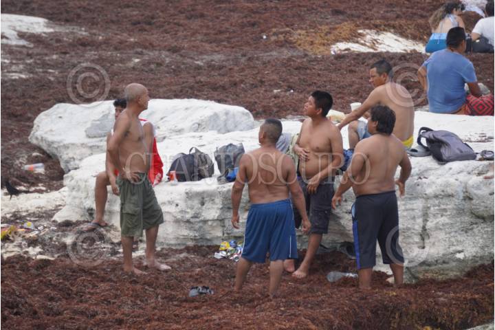CANCÚN, QUINTANA ROO, 08JUNIO2025.- Turistas junto a las grandes cantidades de sargazo que recalan en las playas de Cancún. FOTO: ELIZABETH RUIZ7CUARTOSCURO.COM