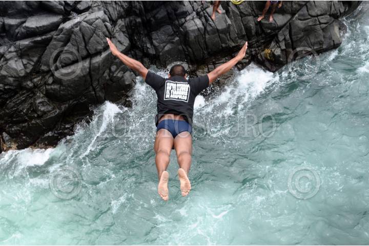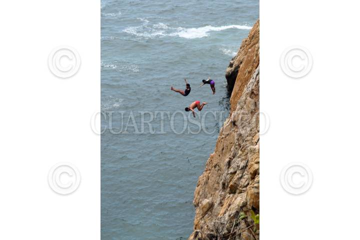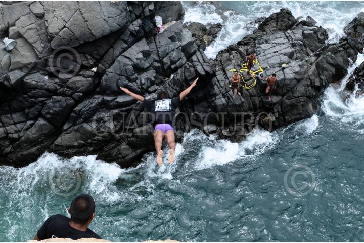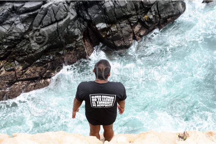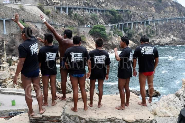 ACAPULCO, GUERRERO, 14ABRIL2011.- Clavadistas de La Quebrada efectuaron una exhibición con playeras negras y mensajes alusivos a la defensa del Tianguis Turístico, el cual se anunció cambiaría de sede para el próximo año. Diferentes sectores productivos del puerto se han sumado a esta campaña que exigen que el "Tianguis" se quede, por lo pronto estos desafiantes de la quebrada han emplazado a una huelga de no cumplirse esta demanda. FOTO: BERNANDINO HERNÁNDEZ/CUARTOSCURO.COM