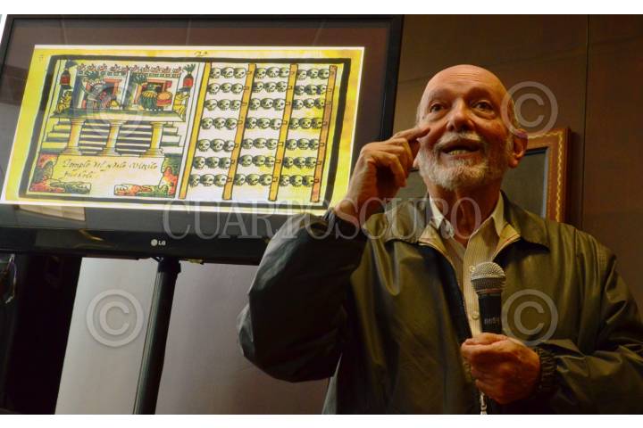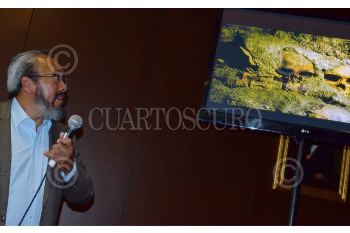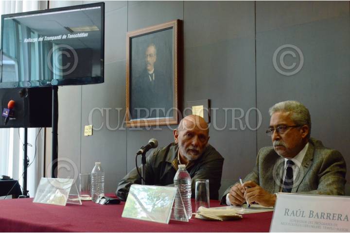 MÉXICO, D.F., 20AGOSTO2015.- Arqueólogos y especialistas en la materia pertenecientes al INAH, comunicaron ante medios de comunicación, el hallazgo del Tzompantli de Tenochtitlán, situado debajo del Templo Mayor en el predio de República de Guatemala. a pesar de se desconoce todavía el número total de cráneos que componen esta pared conformada entre otros elementos, por cal y arena, sería uno de los vestigios más relevantes para la arqueología en México. En la imagen, Eduardo Matos, investigador del INAH, Pedro Francisco Sánchez, coordinador nacional de Arqueología, y Raúl Barrera, supervisor del Programa de Arqueología Urbana del Templo Mayor. FOTO: MARÍA JOSÉ MARTÍNEZ /CUARTOSCURO.COM