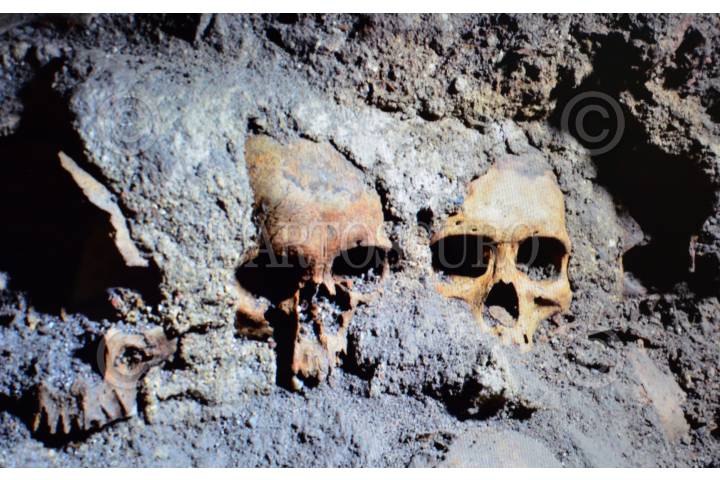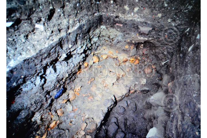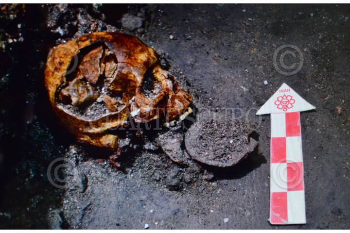 MÉXICO, D.F., 20AGOSTO2015.- Arqueólogos y especialistas en la materia pertenecientes al INAH, comunicaron ante medios de comunicación, el hallazgo del Tzompantli de Tenochtitlán, situado debajo del Templo Mayor en el predio de República de Guatemala. a pesar de se desconoce todavía el número total de cráneos que componen esta pared conformada entre otros elementos, por cal y arena, sería uno de los vestigios más relevantes para la arqueología en México. FOTO: INAH /CUARTOSCURO.COM