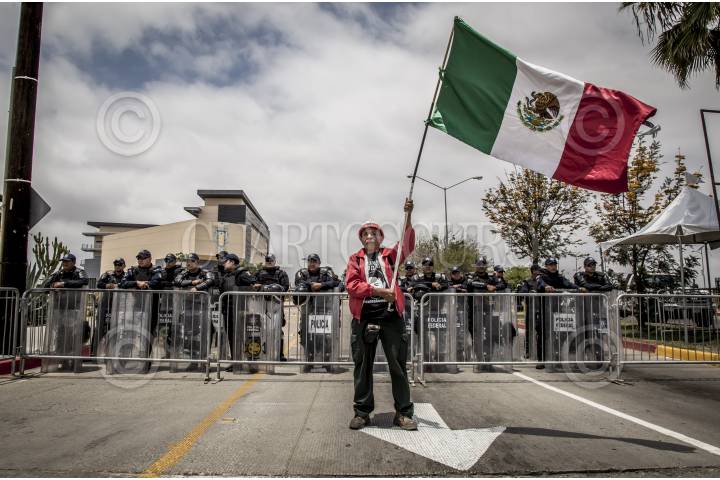 TIJUANA BAJA CALIFORNIA, 20MAYO2018.- Aspectos del despliegue de elementos de seguridad previo al debate entre los cuatro candidatos a la Presidencia de la República. La imagen muestra los primeros manifestantes que han acudido afuera del campus universitario. FOTO: OMAR MARTÍNEZ /CUARTOSCURO.COM