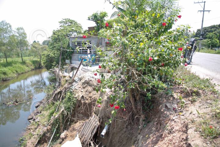 VILLAHERMOSA, TABASCO, 31MARZO2010.- Sobre la carretera interestatal que conduce de Villahaermosa hacia la villa Ixtacomitán a la altura del kilómetro ocho se ubica una zona de latente peligro, ya que este lugar esta sufriendo hundimientos. En la imagen la zona que ya empezó a hundirse y en un costado la casa de una humilde familia que pronto podría sufrir una tragedia. FOTO: MARCO POLO GUZMÁN HERNÁNDEZ/CUARTOSCURO.COM