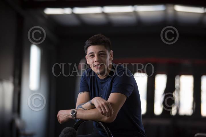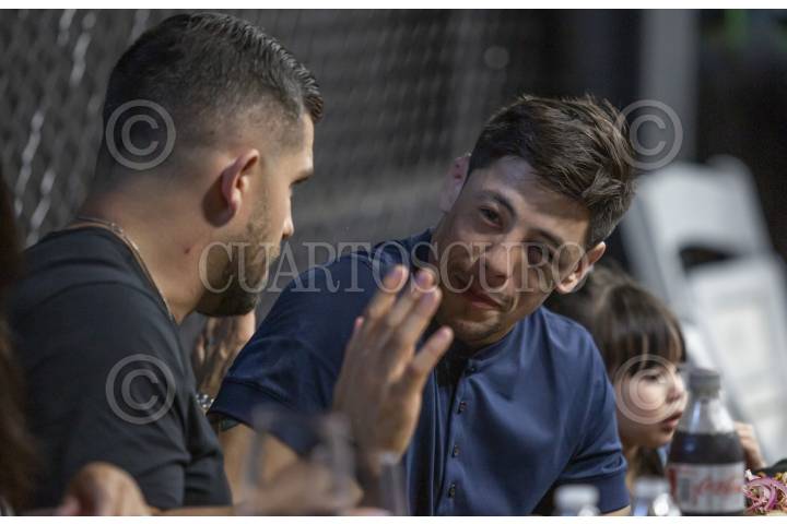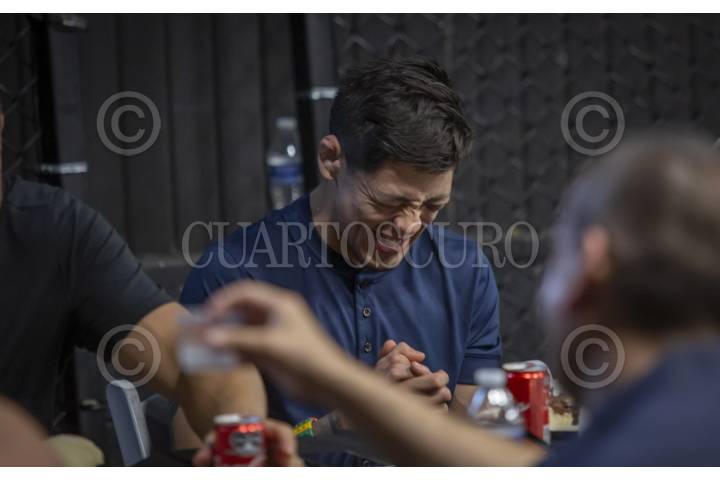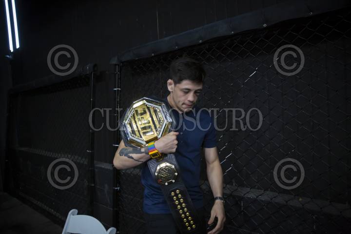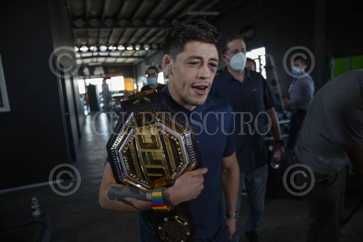 Brandon Moreno en conferencia de prensa con periodistas mexicanos después de conseguir el campeonato de la UFC (Ultimate Fighting Championship).