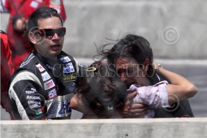 PUEBLA, PUEBLA 14JUNIO2009.- Carlos Pardo falleció este domingo, luego de sufrir un aparatoso accidente en las últimas vueltas de la cuarta fecha de la Nascar México Series 2009 en el autódromo Miguel E. Abed, el piloto capitalino fue alcanzado en la parte central de su auto por Jorge Goeters cuando se disputaban las últimas vueltas y tras el contacto salió disparado contra un muro de contención de la pista poblana. En la imágen Ana la esposa del piloto es consolada Ruben Pardo hermano del Piloto FOTO: EL GOLFO CENTRO/CUARTOSCURO.COM