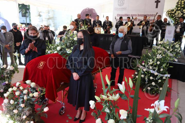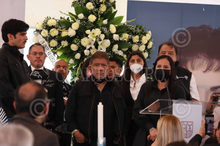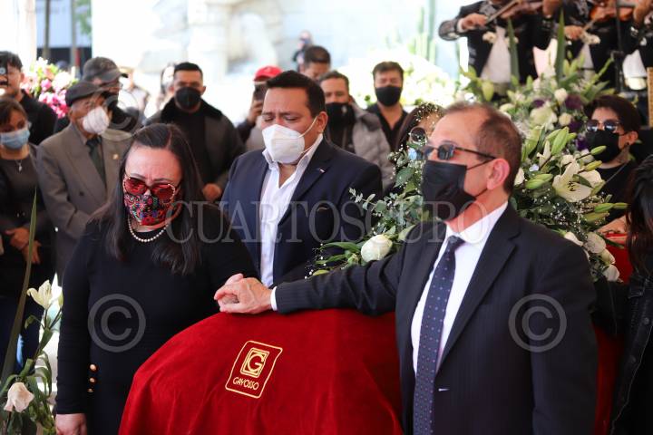 María Eugenia Plascencia, Gustavo Briones, Jesús Briones, y familia durante el homenaje de cuerpo presente de la actriz Carmen Salinas en la explanada del Monumento a la Madre.