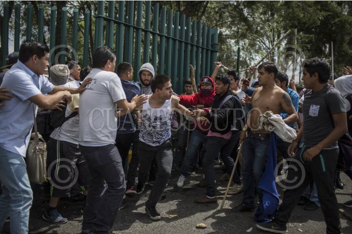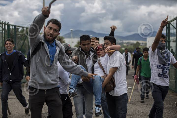 MORELIA, MICHOACÁN, 22SEPTIEMBRE2016.- Estudiantes de la Universidad Michoacana de San Nicólas de Hidalgo (UMSNH), intentaron desalojar a miembros del Movimiento de Alumnos Rechazados (MAR) que son respaldados por miembros de las casas del estudiante (CUL) y normalistas de la (ONOEM). El conflicto provoco varios enfrentamientos en la facultad de Odontología y en Ciudad Universitaria dónde estudiantes lograron ingresar pero fueron repelidos con rocas y palos provocando heridos del bando de los estudiantes con matricula. FOTO: ALAN ORTEGA /CUARTOSCURO.COM