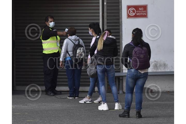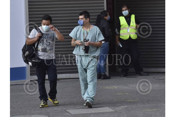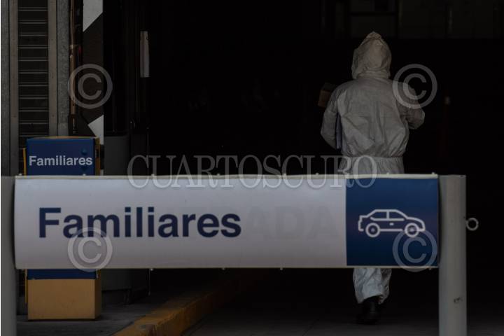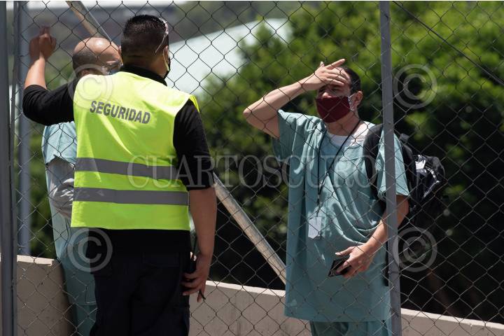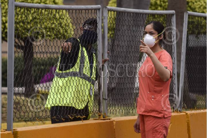 Poca actividad continúa en la Unidad Temporal Covid-19 instalada en el Centro Citibanamex, después de ayer en la noche llegara el primer paciente. En la imagen, médicos preguntan al personal de seguridad en uno de los accesos.