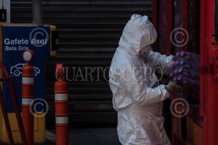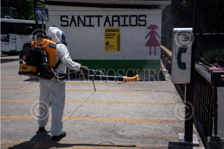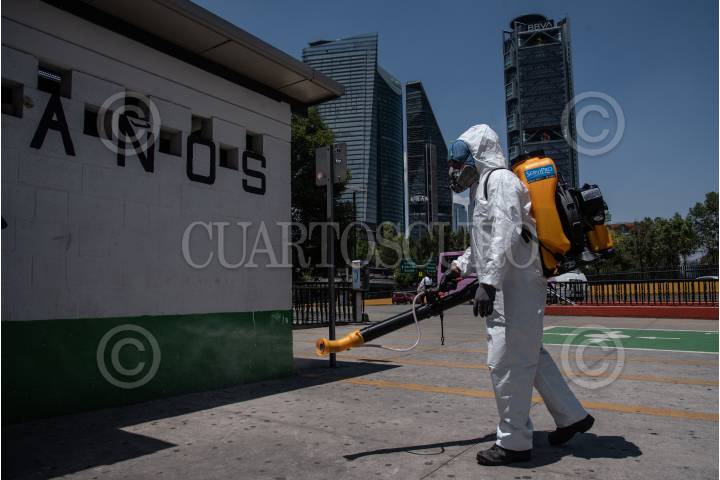 Trabajadores realizan proceso de sanitización en uno de los accesos del metro Chapultepec, para prevenir la propagación de coronavirus (covid-19).