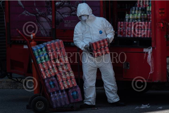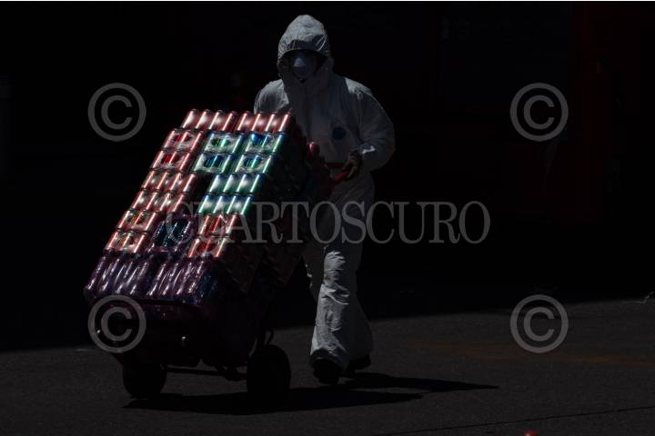 Poca actividad continúa en la Unidad Temporal Covid-19 instalada en el Centro Citibanamex, después de ayer en la noche llegara el primer paciente. En la imagen, distribuidores de refrescos ingresan al lugar, portando trajes especiales.