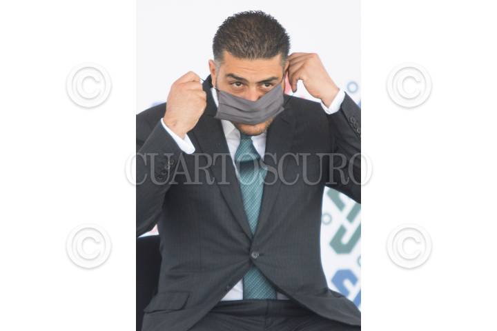 Omar García Harfuch, secretario de Seguridad Pública, se acomoda el cubrebocas durante la ceremonia de graduación de cadetes en la Universidad de la Policía de la Ciudad de México.