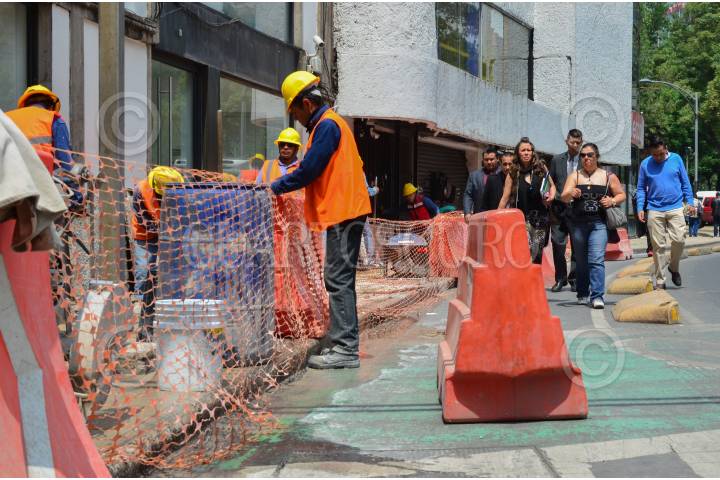 MÉXICO, D.F., 24JUNIO2015.- Trabajos de repavimentación en las banquetas sobre Reforma impiden en algunos tramos la circulación libre de peatones, quienes se ven obligados a invadir la ciclovía. Esto representa un peligro para peatones pues los automovilistas transcurren velozmente sobre la lateral. FOTO: MARÍA JOSÉ MARTÍNEZ /CUARTOSCURO.COM