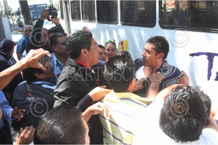 OAXACA, OAXACA, 20MARZO2017.- Operadores de la empresa Choferes del Sur y que conforman el Federación Obrera Revolucionaria Auténtica Socialista de la República Mexicana (FORASRM) iniciaron este lunes una huelga aprobada por la Junta Local de Conciliación y Arbitraje en demanda de la revisión del contrato colectivo de trabajo, sin embargo la parte patronal que representa la empresaria Alejandra Gómez Candiani no atendió el conflicto lo que detonó la huelga. Gómez Candini de presentó en la zona en la que se realiza la huelga para demandar a los manifestantes dejaran de detener a los choferes que sí laboraban. FOTO: ARTURO PÉREZ ALFONSO / CUARTOSCURO.COM