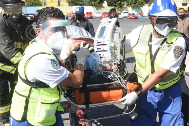 Paramédicos realizan traslado en el estacionamiento de un centro comercial en la México-Tacuba de una menor con lesiones cervicales severas, desde helicóptero el cual llegó desde el Hospital de Milpa Alta.