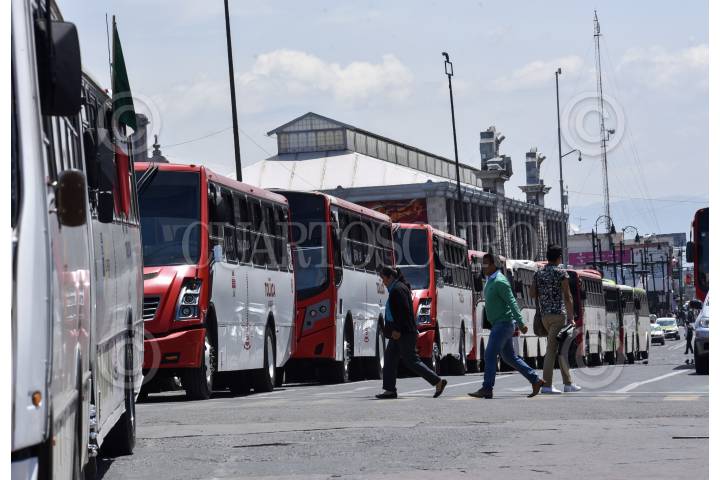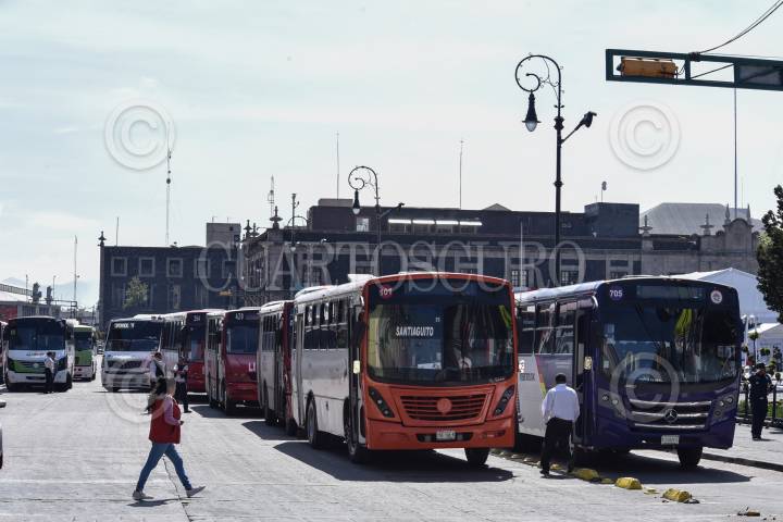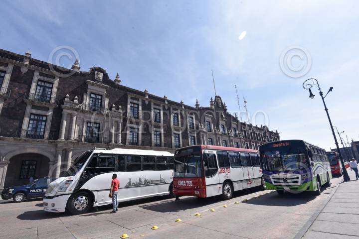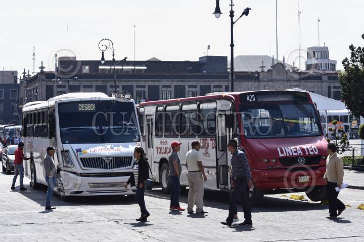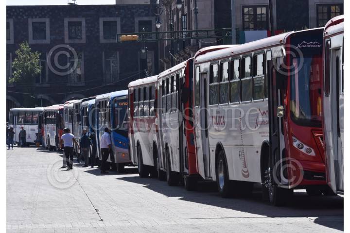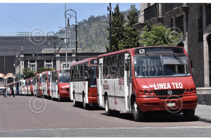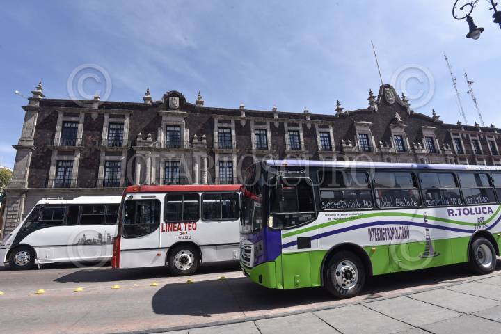 TOLUCA, ESTADO DE MÉXICO, 03SEPTIEMBRE2019.- Camiones de transporte público de diversas líneas que operan en Toluca se manifestaron frente a Palacio de Gobierno expresando su rechazo a la entrada de transporte tipo urvan en el Valle de Toluca. FOTO: CRISANTA ESPINOSA AGUILAR /CUARTOSCURO.COM