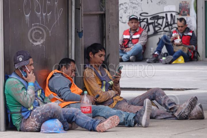 CIUDAD DE MÉXICO, 03JUNIO2025.- Trabajadores de obras descansan observando su celular sobre una de las banquetas en Avenida Juárez. FOTO: GRACIELA LÓPEZ/CUARTOSCURO.COM
