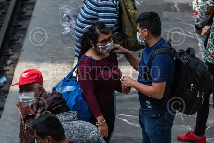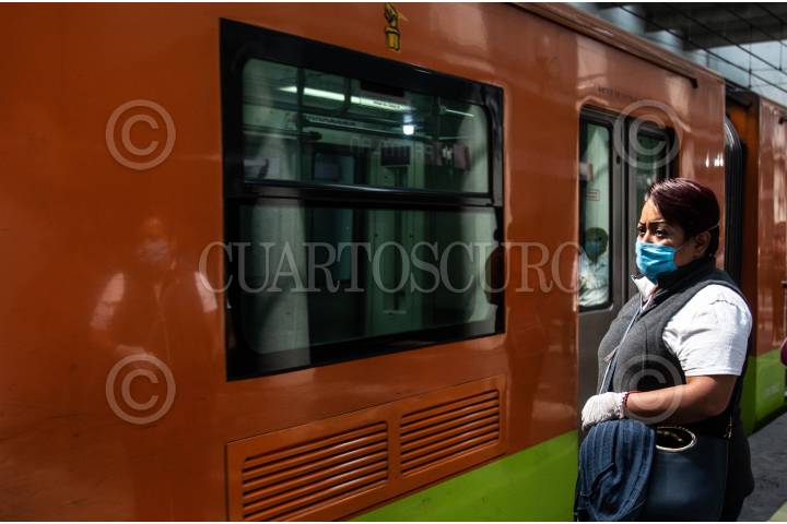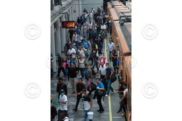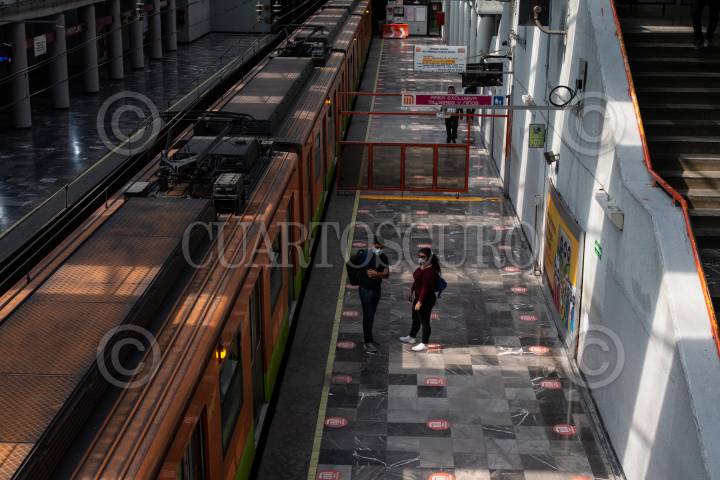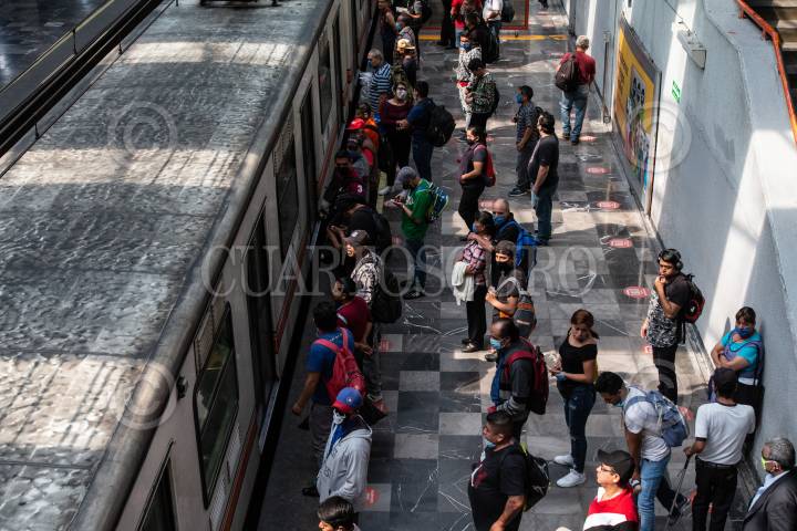 Ante la afluencia mayor de usuarios en esta linea se colocaron señalamientos para respetar la “La sana distancia” que pocos llevan a cabo sobre todo al entrar y salir de vagones
