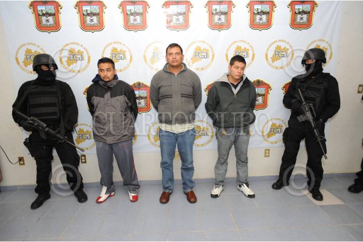 TEXCOCO ESTADO DE MÉXICO 14JUNIO2009.- El aseguramiento de Miguel Ángel Vargas Álvarez, alias “El Miguel”, de 22 años; Jorge Torres Rubio, “El Largo”, de 37 años y de Juan Carlos Mendoza Aguilar, “El Mangui”, de 20 años, a quienes se les aseguró un arma de grueso calibre, permitió a la Unidad de Homicidios de la Procuraduría General de Justicia adscrita a este municipio, aclarar el homicidio de tres jóvenes, hechos ocurridos el pasado 23 de abril.De acuerdo con la investigación que inició la Policía Ministerial por la averiguación previa TEX/AMOD/ I/918/09, que da cuenta de la muerte violenta de Eric René Medina Morales, de 23 años; Jessica Estephany Portugués Téllez de 22 años y David Medina Morales, de 27 años, quienes fueron privados de la vida, por los ahora detenidos en venganza, después de una pelea en el interior de una discoteca de Los Reyes La Paz. Los implicados fueron ubicados en un negocio de auto lavado de automóviles, situado en el poblado de Coatlichán y su captura fue durante un operativo, debido a que al momento de su detención Torres Rubio portaban una pistola Browning, tipo escuadra, calibre 9 milímetros, misma que al ser revisada, se descubrió que fue el arma utilizada para ultimar a los mencionados jóvenes el pasado mes de abril FOTO: LUIS CARBAYO/CUARTOSCURO.COM