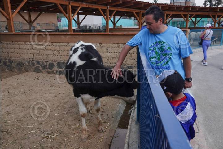 Un niño acompañado de su papá acariciaba una vaca en la granja de la Utopía Libertad, en la alcaldía Iztapalapa