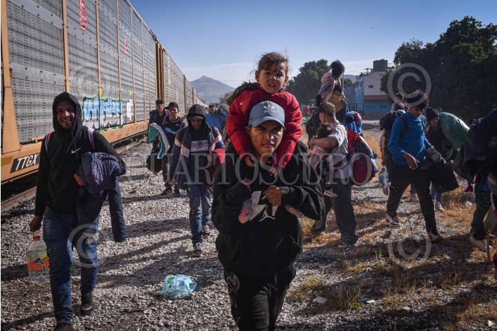 GÓMEZ PALACIOS, DURANGO, 17DICIEMBRE2024.- Después de días esperando el tren, durmiendo a un costado de las vías ferroviarias, un grupo de alrededor de 200 migrantes, provenientes en su mayoría de Venezuela, se montaron en los vagones para continuar su camino al norte del continente. FOTO: PEDRO ANZA /CUARTOSCURO.COM