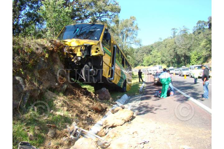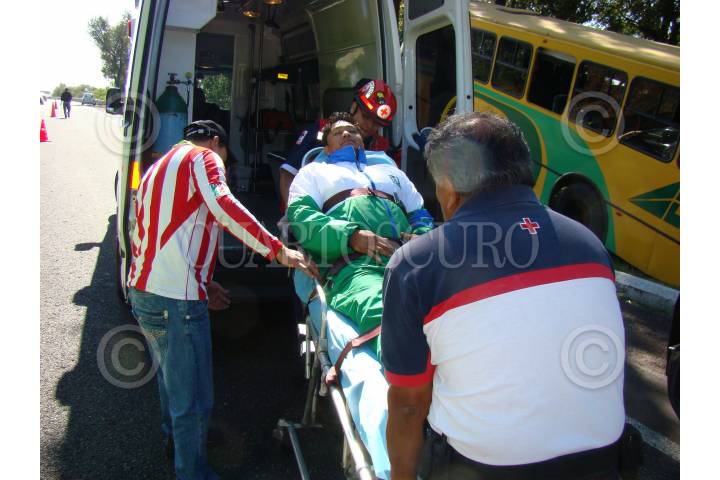 CUERNAVACA, MORELOS, 15OCTUBRE2008.- La mañana de este sábado se registró un accidente en la autopista México-Cuernavaca (dirección sur), kilómetro 64+500, antes de llegar a la curva de La Pera, en donde resultaron lesionadas 22 personas. El percance se registró a las 08:52 horas aproximadamente, cuando se solicitó la presencia de los cuerpos de rescate, acudiendo personal del Escuadrón de Rescate y Urgencias Médicas a bordo de la R-05, de Capufe, Cruz Roja y Surgemed, quienes se trasladaron a brindar los servicios prehospitalarios. Resultaron involucrados un autobús con placas de circulación 229RJG, Línea Alipu, color amarillo, económico 496, del Servicio Público Federal, conducido por Ernesto Ortiz Reyna, los cuales se dirigía a un partido de fútbol a Oaxtepec; un vehículo Volkswagen, tipo Bora color negro, con placas de circulación 937-VDP del DF, uno motocicleta Harley Davison, color negra, con placas JAB-11 del Estado de México. FOTO: LUIS GIRON/CUARTOSCURO.COM