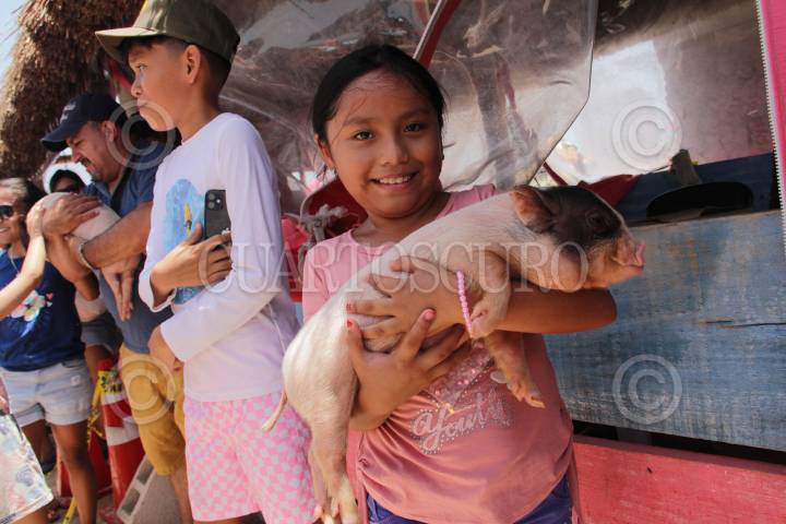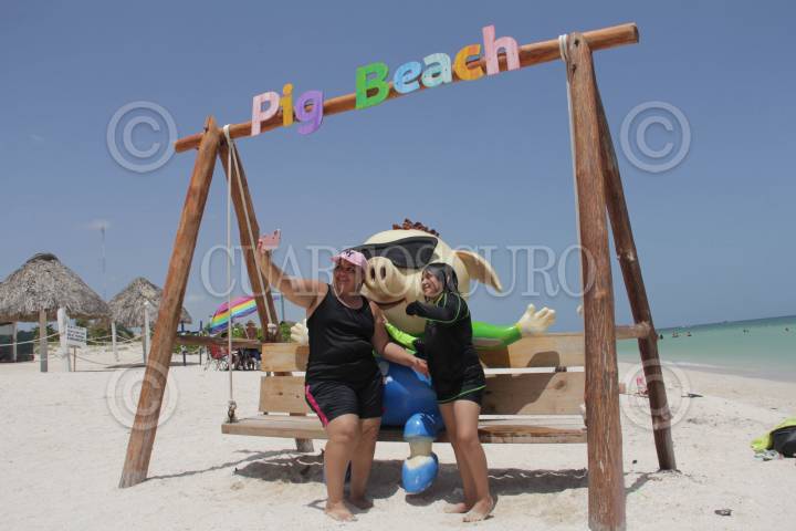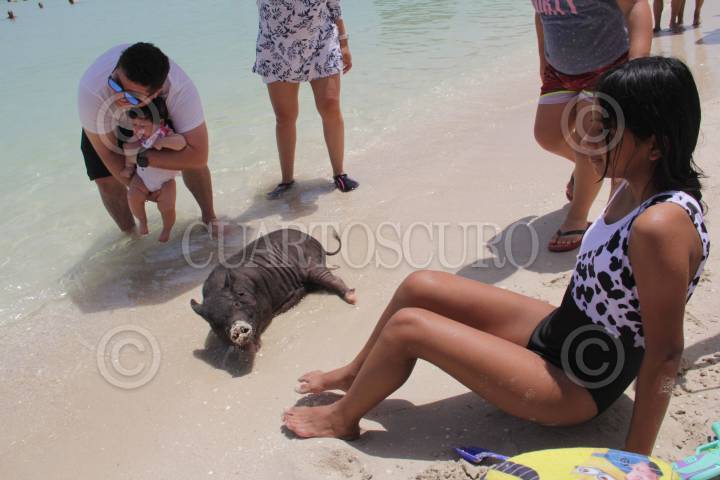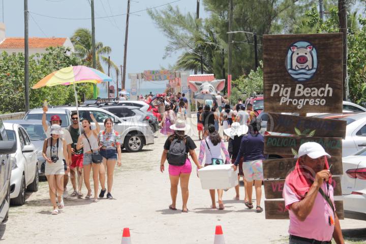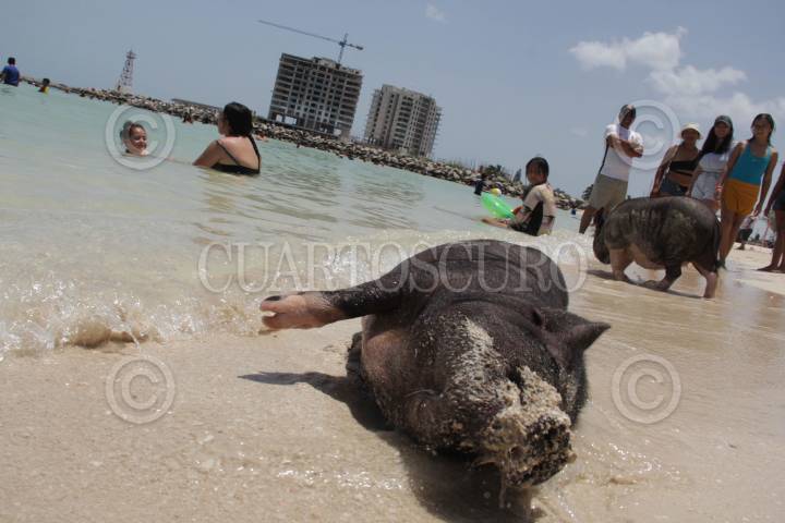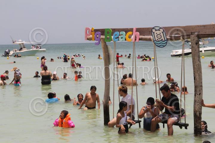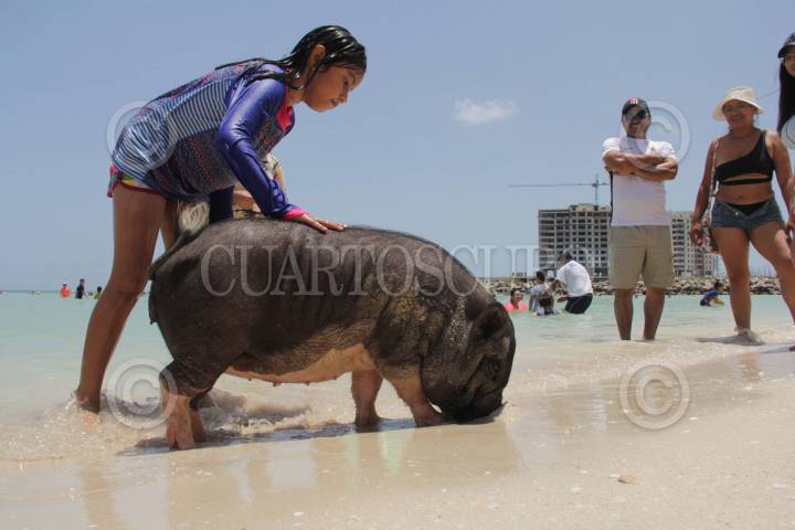 Turistas se dieron cita en la Pig Beach en Puerto Progreso, ahí pudieron convivir con cerditos que gustan de mojarse y revolcarse en la playa quienes dieron la bienvenida a las vacaciones de verano.
